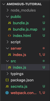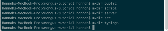 Go to your terminal and follow your directories to wherever you want your project to belong. In your command line run: “mkdir amongus-tutorial” to create your folder. “cd amongus-tutorial” to enter the folder. Inside your folder, run the commands “git init” to initialize git and “npm init” to initialize your package.json. Go through the prompts after running npm init, you don’t have to put anything in the prompts, just press enter to go all the way through, or you can name your project and add descriptions, your choice.