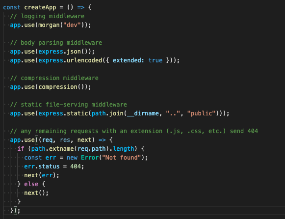 Now we are going to make a function that creates our app. When it runs, it tells our app to use Morgan to log our middleware, we include a body parsing middleware that sits conveniently on express, and compression middle wear. We tell the server where to get our static files, and we provide an error handler at the end incase a client requested page associated with our app does not exist.