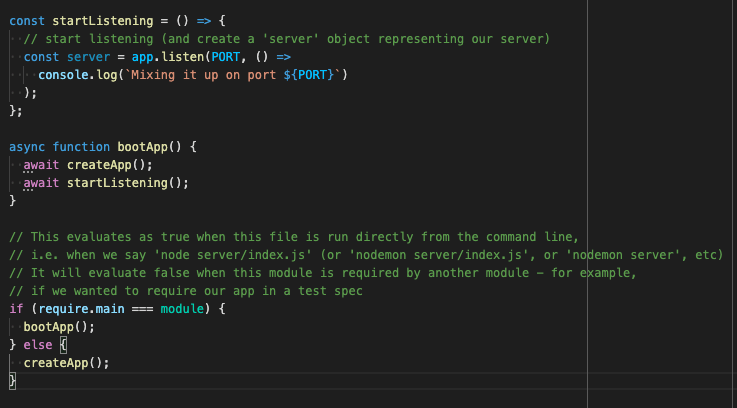 Our last step for setting up our server is to listen to our Port, and boot the app. Add the following code to the bottom of your index.js file