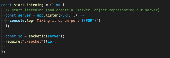 Our server is up, we have our game initialized, now we need to incorporate socket. Inside of your server folder, create a new folder called socket, and create a file inside of it called index.js. Now that we’ve created where our sockets will live, we can require it into our server. Go to your server/index.js and find the startListening function that we wrote. Include our socket io variable and require our socket folder in at the bottom of startListening func.