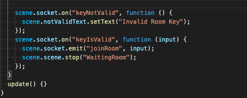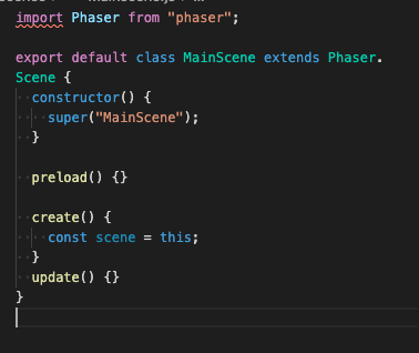 Inside of our update function, let’s handle player movement. We place this inside of the update function because update can recognize these actions at any time, as opposed to create which runs once when the scene is launched.